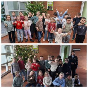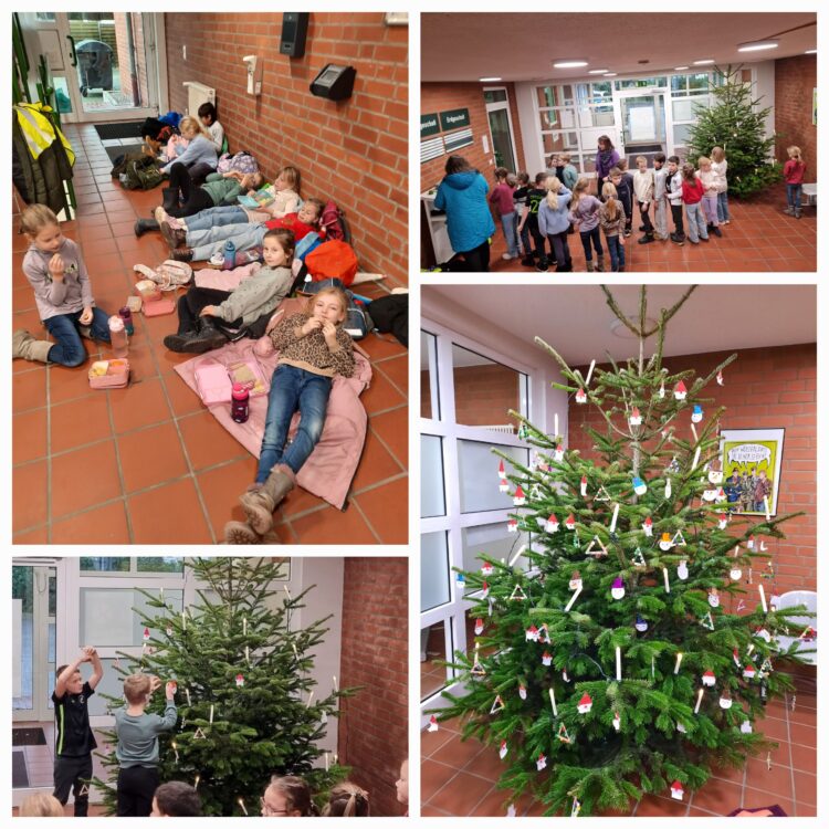 Der große, beleuchtete Baum wartete im Eingangsbereich schon auf die Kinder, die dort zunächst von Frau Gartzke begrüßt wurden. Mit der Unterstützung zweier Mütter, die auch schon beim Basteln tatkräftig geholfen haben, konnten die etwa 120 Anhänger zügig am Baum verteilt werden und lassen die Tanne nun in farbenfrohem Glanz erstrahlen. Die Kinder waren sichtlich stolz auf ihr Werk – und das dürfen sich auch wirklich sein.